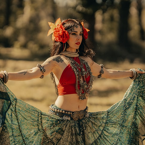 Un estilo zíngaro vibrante, alegre y frenético, que se nutre de la música apasionada de los Balcanes y del arte del faldeo, lleno de color y movimiento. Integra técnicas de danza del vientre tribal fusión y Fat Chance Bellydance (ATS®), junto con influencias de otras danzas del mundo.