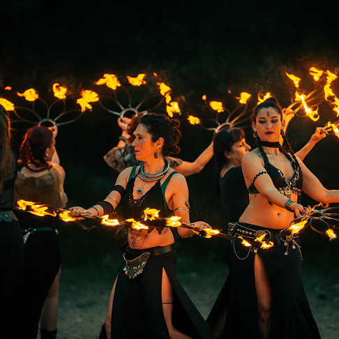 ¡Las brujas bailan con fuego! Esta danza fusiona la técnica tribal con la magia y el poder de los abanicos de fuego.